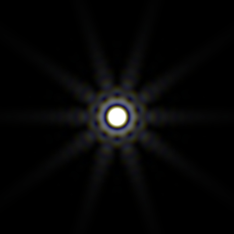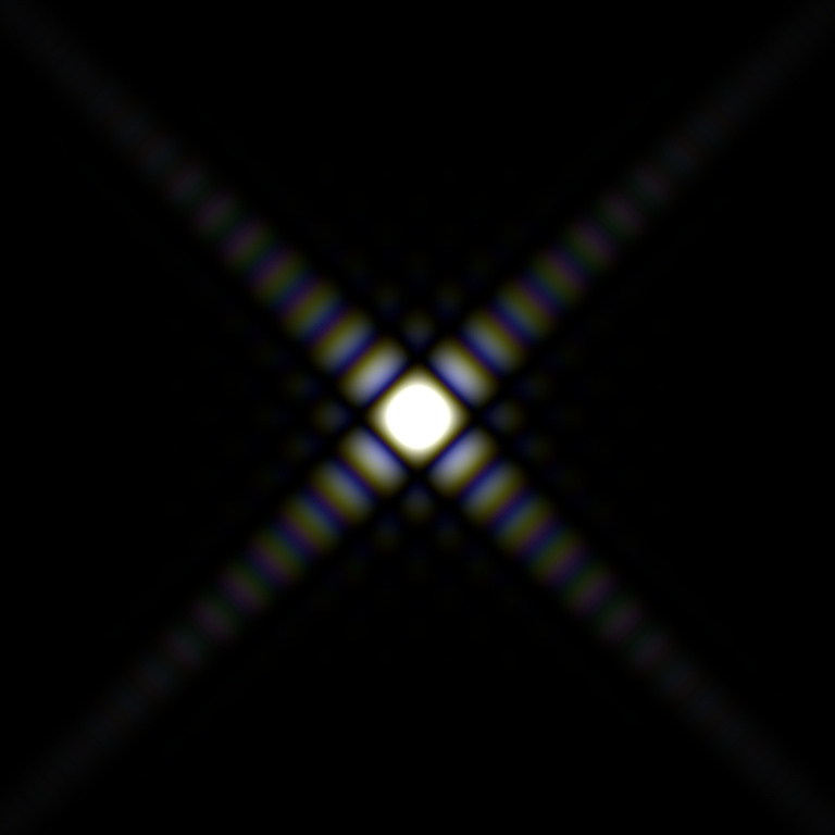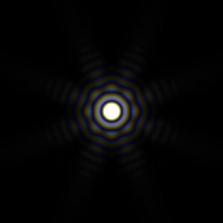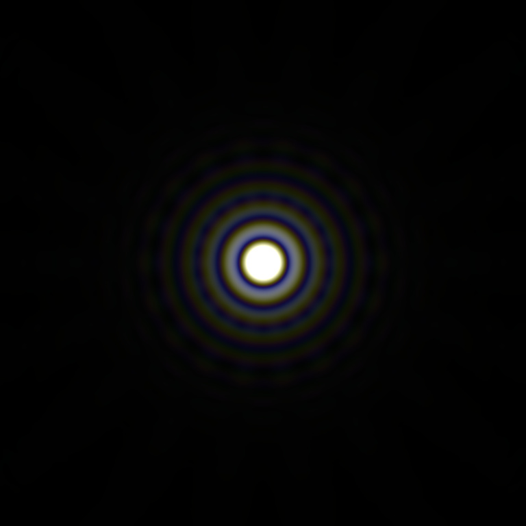 The images shown are for illustration only (Using a tiny aperture size of 0.1 mm, and cropped). In reality, the visible parts of the glare images used are very small, with just one bright pixel at the center, such as this cropped image of the glare from a circular aperture (target: 1024, cropped to 256):