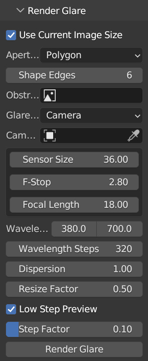 Low Step Preview: Enabling this previews the glare using fewer “Wavelength Steps”, scaled by the “Step Factor”. This improves render performance but shows an approximation of the final glare effect. Useful for quicker preview renders before final high quality output.